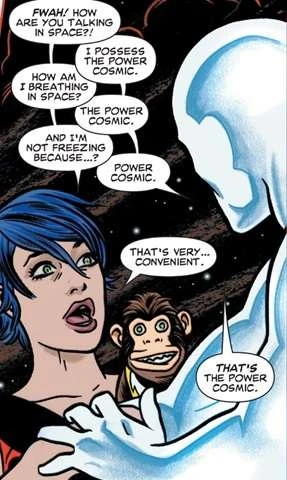 - After Boomstick sarcastically notes the convenience of the Silver Surfer's ability to create an infant star in his analysis, Wiz responds with "That's the Power Cosmic.", referencing this panel from Silver Surfer Vol.7 #3.